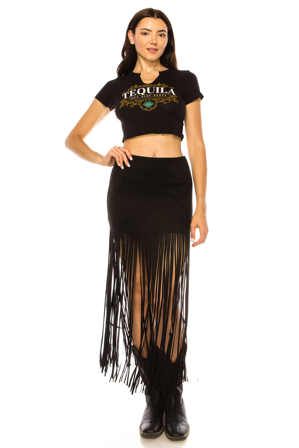 Make a statement with this edgy crop top featuring a bold "Tequila 100% Blue Agave" screen print that demands attention. Crafted from a 95% cotton and 5% spandex blend, this piece delivers comfort and flexibility for nights out or casual days. The breathable fabric moves effortlessly with your body while the spandex keeps everything in place and maintains its shape. Whether you're channeling attitude or adding edge to your everyday look, this crop top is the perfect wardrobe essential. Note: Runs small with generous stretch. Our 5'9" model wearing a size small (35"-25"-37") showcases just how flattering this piece truly is.