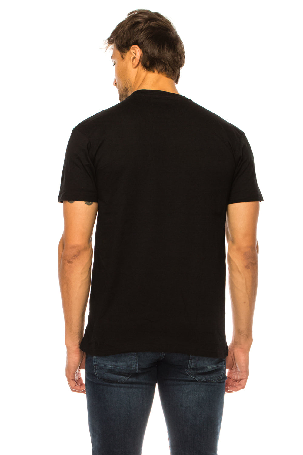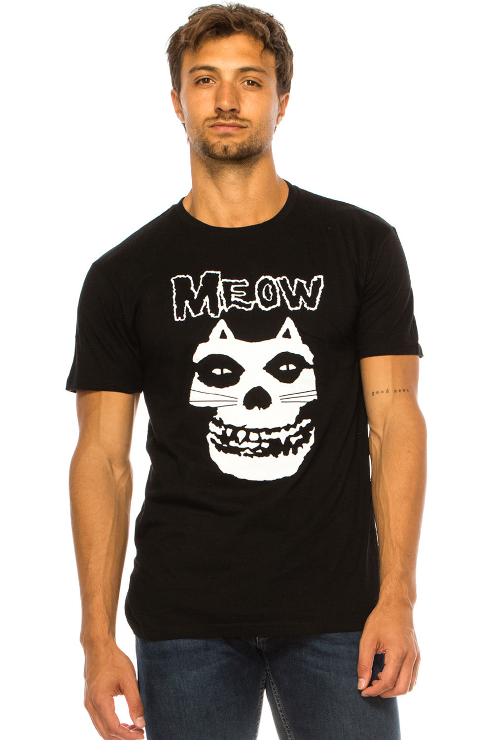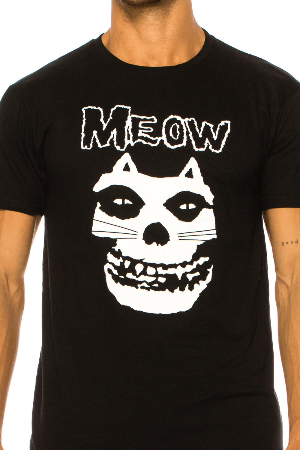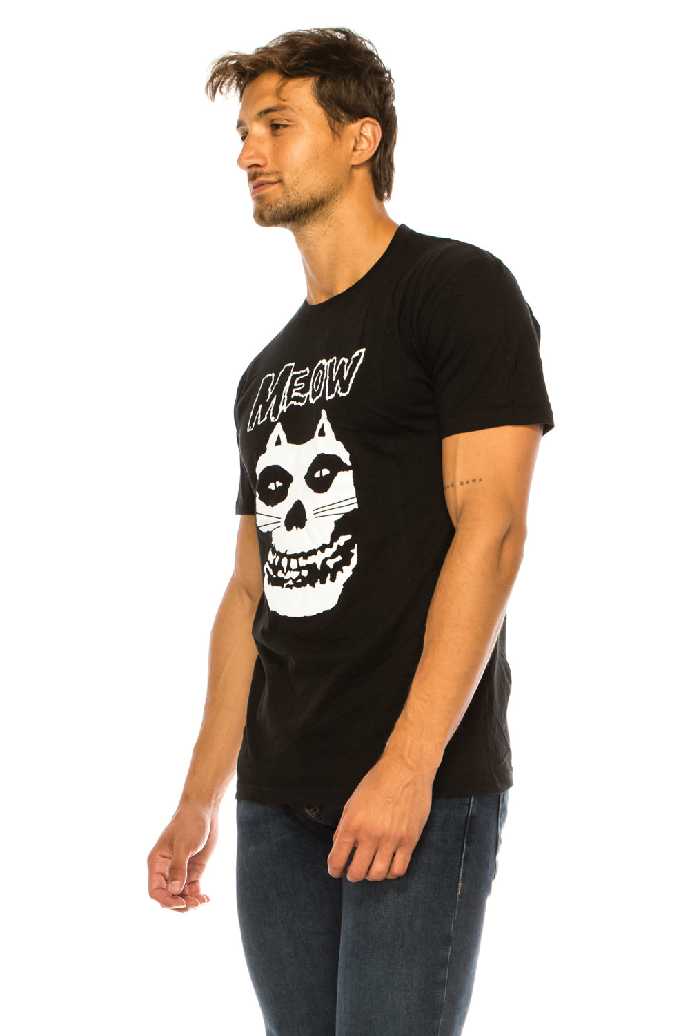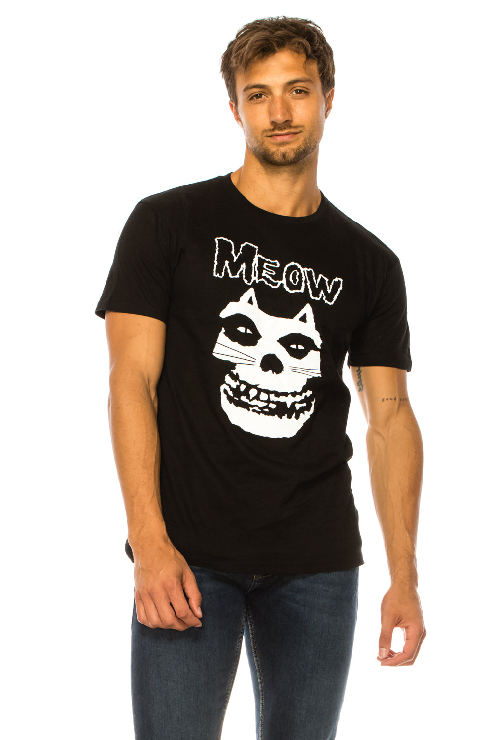 Misfit Meow T Shirt. Made with 100% combed cotton and enzyme washed for a soft feel, this black t shirt is lightweight and resistant to shrinking. With a bold screen print on both the front, this shirt makes a fun statement. Our model is 6'2" and wearing a medium with a shirt size of 16.5/31 and suit size 41 long.