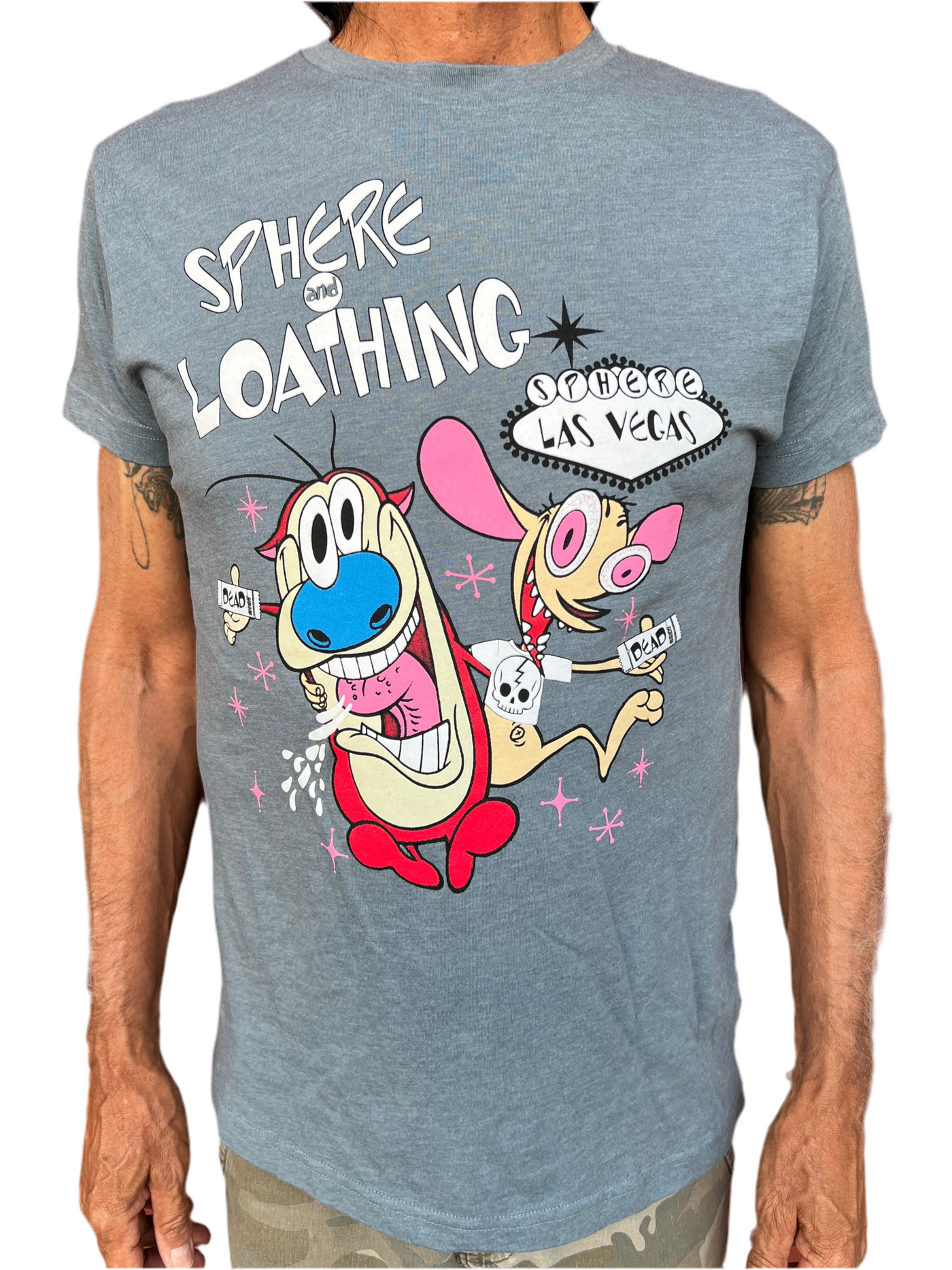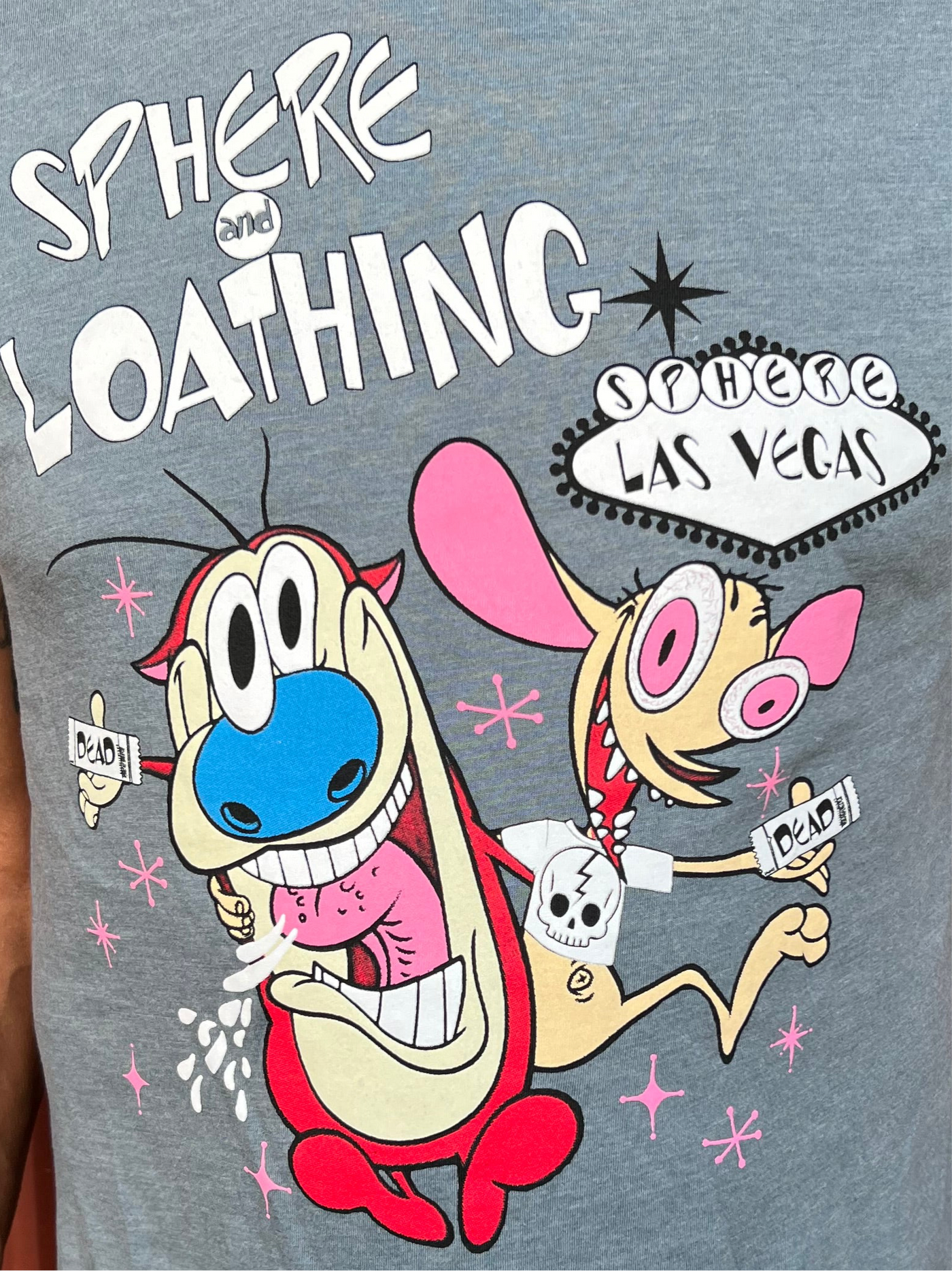 Ren and Stimpy Sphere and Loathing T Shirt. Ren and Stimpy do The Dead at the Sphere in Las Vegas. This shirt is 100% enzyme washed cotton. This soft and lightweight 4.3 ounce t shirt is very comfortable and has the perfect fit. Get ready to laugh and reminisce with this Ren & Stimpy Sphere & Loathing T Shirt! Featuring the iconic duo doing The Dead at Las Vegas' Sphere, this 100% enzyme washed cotton shirt is a must-have for any fan. Lightweight and soft, it's the perfect fit for any occasion. Our model, wearing a size medium with a 40" chest, stands at 5'10".