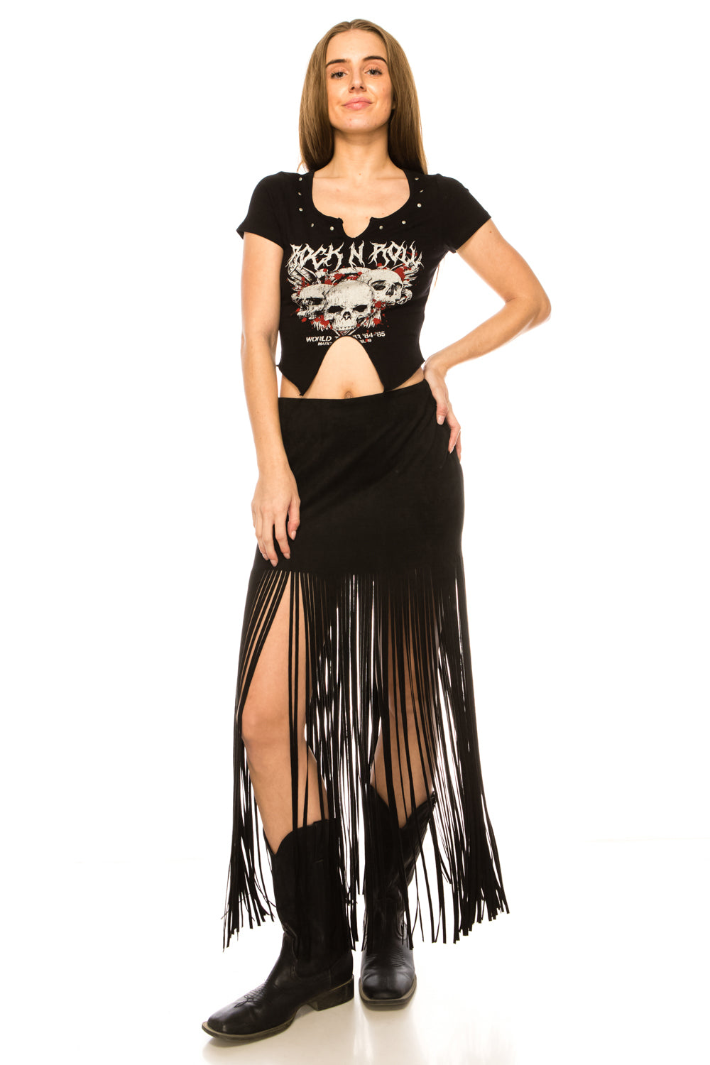 Elevate your edgy wardrobe with this Rock n Roll skull studded short sleeve top—the perfect blend of attitude and comfort. Crafted from a breathable 95% cotton and 5% spandex blend, it delivers the stretch you need for all-day wear without sacrificing that bold aesthetic. Our 5'8" model in a small showcases how beautifully this piece fits (31"-25"-35" measurements), so you can confidently find your ideal size and rock that rebellious look.