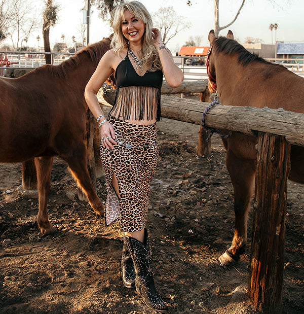 Long fringe halter top is made of light weight black nylon spandex. It is adjustable front and back ties behind the neck. Model is 5'7" with measurements of 32"-25"-35" and wearing a size small.