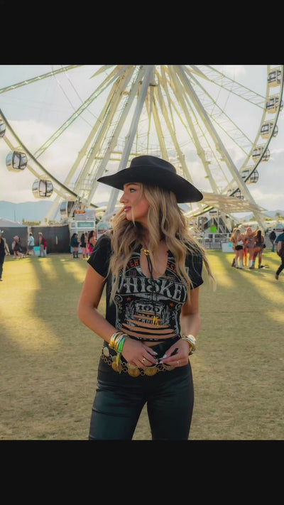 The TENNESSEE WHISKEY SLASHED CROP TOP is a must-have for any passionate fan of Tennessee Whiskey. Its alluring slashed design and short sleeves make it the perfect statement piece for country concerts and rodeos. Get ready to wow the crowd and make a bold statement with this irresistible graphic tee that looks so good with these leopard bell bottoms! Model is 5'9" measurements are 34" -24" - 35" she's wearing a size small.