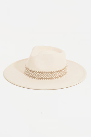 Complete your look with this cream color wide brim western hat with woven hat band. 90% wool 10% polyester. One size adjustable inside string. Pinched front crease. 4" crown 3 3/4" brim.